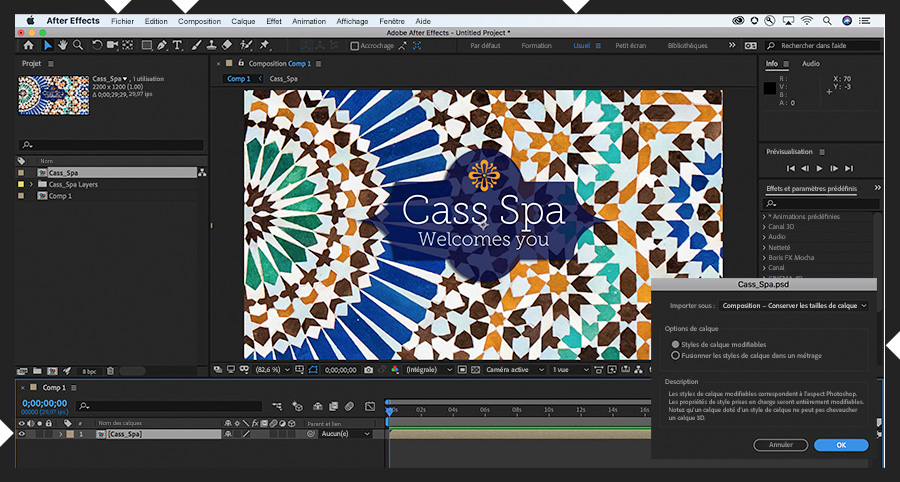 Dans l’espace de travail Usuel d’After Effects, choisissez Fichier > Importer > Fichier et importez votre logo multicalque d’Adobe Illustrator ou de Photoshop sous forme de composition en conservant les tailles de calque. Activez l’option Créer une composition et cliquez sur Ouvrir. Dans la boîte de dialogue suivante, vérifiez que les options de calques sont définies sur Styles de calque modifiables et cliquez sur OK. Créez une composition (Composition > Nouvelle composition) de 1 920 x 1 080 pixels. Faites glisser la composition Cass_Spa précédemment créée dans votre nouvelle composition pour la transformer en précomposition. Le logo en taille réelle est recadré en conséquence.