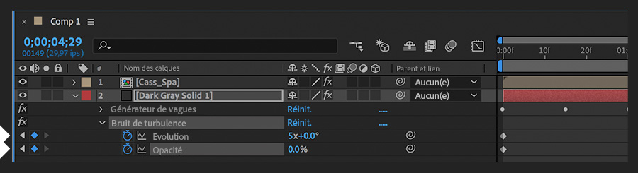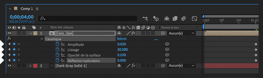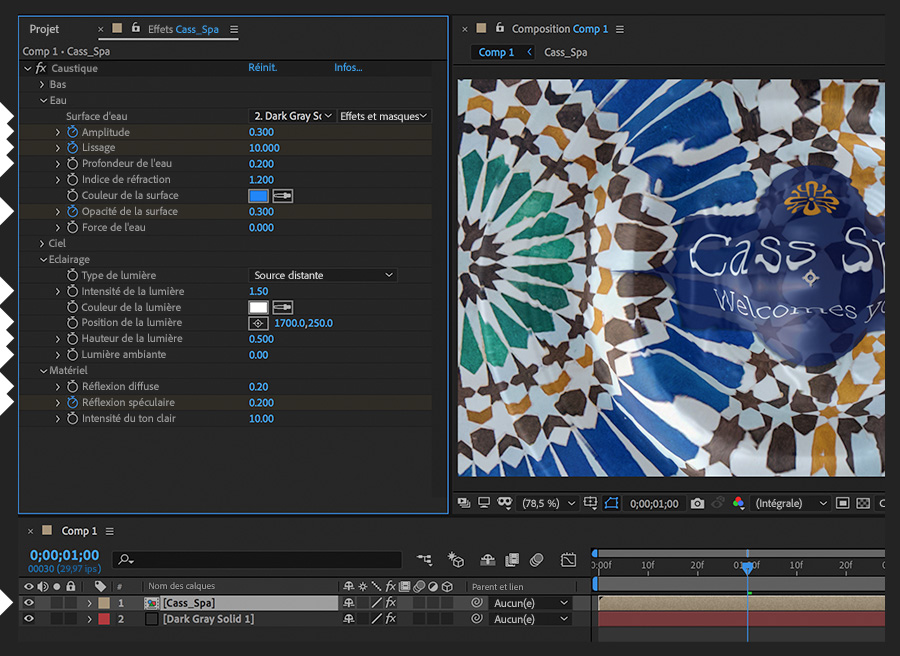 Pour ajouter un motif d’ondulation, créez un solide (Calque > Nouveau > Solide). Il doit être placé au-dessus de la précomposition Cass_Spa dans le panneau Montage. Faites glisser l’effet Générateur de vagues du panneau Effets et paramètres prédéfinis vers le solide. Placez la tête de lecture au début de la composition. Dans le panneau Effets, paramétrez l’option Afficher sur Hauteur de la table. Développez la section Simulation et définissez Réfléchir les contours sur Tout. Développez la section Réalisateur 1. Définissez la fréquence sur 3 et cliquez sur son chronomètre pour définir une image clé. Pour espacer les ondulations, avancez la tête de lecture d’une demi-seconde et mettez la fréquence à zéro. Tant que vous y êtes, définissez une image clé pour l’amplitude. Avancez encore la tête de lecture d’une demi-seconde et mettez l’amplitude à zéro. Prévisualisez votre animation, puis placez le solide sous le calque de la précomposition pour le cacher.