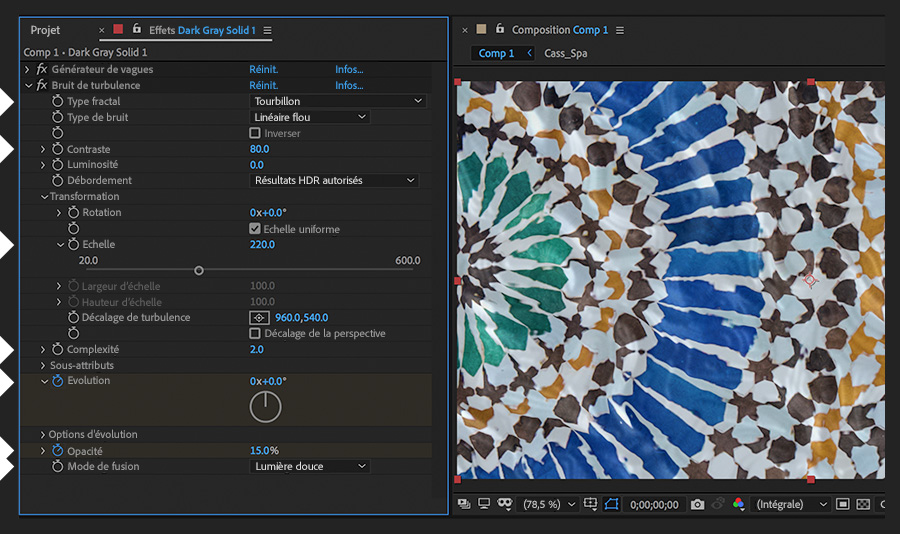 Ajoutez du bruit car, dans la réalité, les ondulations de l’eau ne sont pas régulières. Faites glisser l’effet Bruit de turbulence du panneau Effets et paramètres prédéfinis vers le calque solide, puis placez la tête de lecture au début de la composition. Définissez Type fractal sur Tourbillon, puis diminuez le contraste, augmentez l’échelle, réduisez la complexité et définissez une image clé pour Évolution et une autre pour une valeur Opacité inférieure. Enfin, définissez le mode de fusion sur Lumière douce.