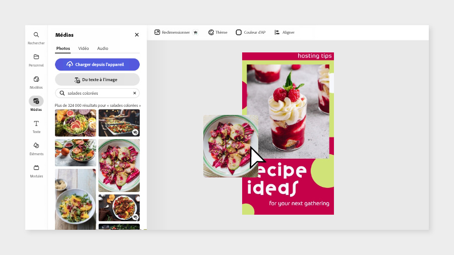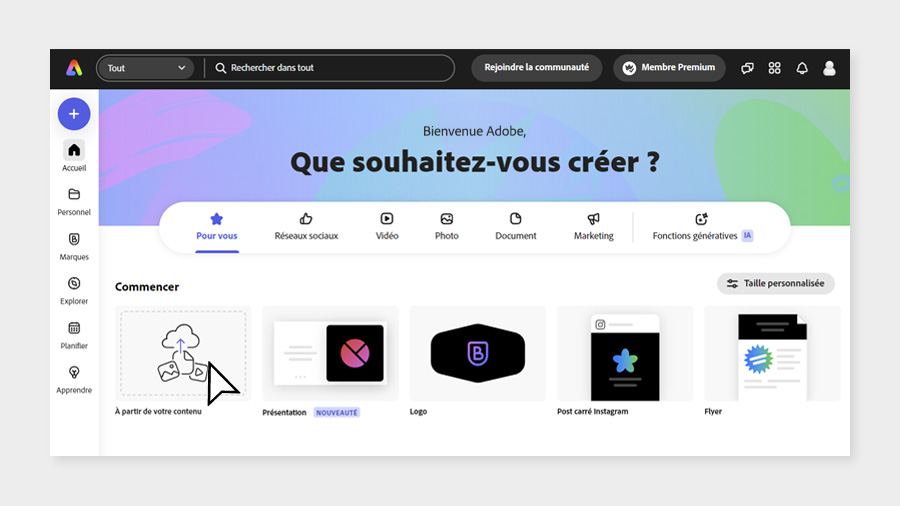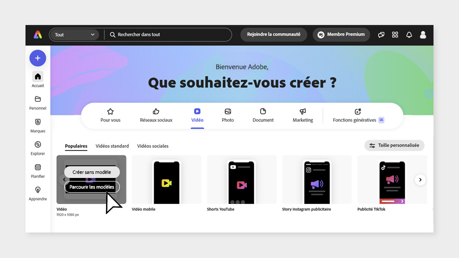 Faites opérer la magie du multimédia en quelque clics. Partez d’une zone de travail vierge ou choisissez un modèle adapté à l’ambiance recherchée. Ensuite, chargez un fichier ou puisez parmi les nombreux contenus proposés par Adobe.