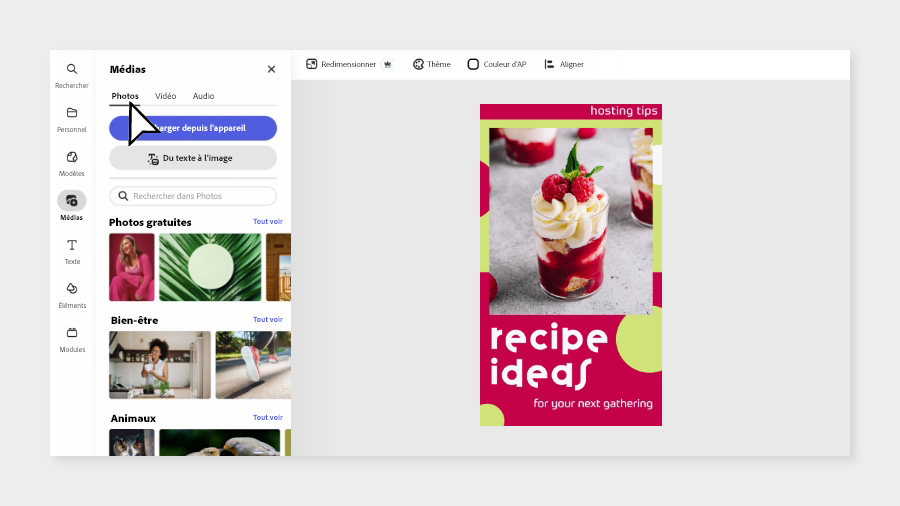 Chaque onglet vous permet de charger des médias dont vous disposez déjà ou de rechercher un nouveau contenu dans la bibliothèque Adobe Express.