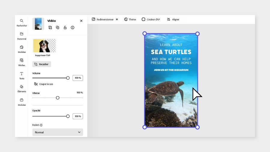 Pour appliquer un effet, ouvrez votre vidéo dans l’éditeur d’Adobe Express, puis sélectionnez son calque pour afficher le panneau Vidéo.