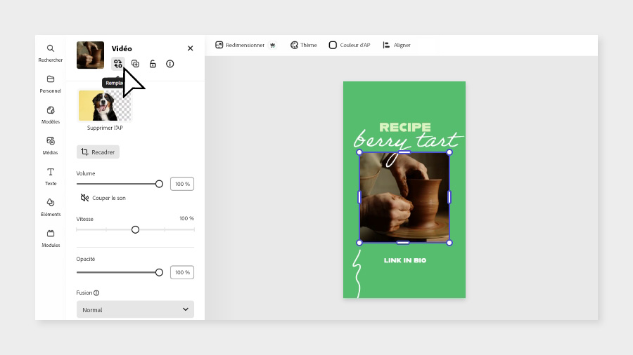 Cliquez sur le modèle à utiliser pour votre vidéo. Le modèle est alors ajouté sur la zone de travail. Vous pouvez maintenant le modifier ou ajouter d’autres scènes. L’icône Remplacer permet aussi de remplacer les vidéos du modèle par les vôtres en y appliquant instantanément les mêmes effets.