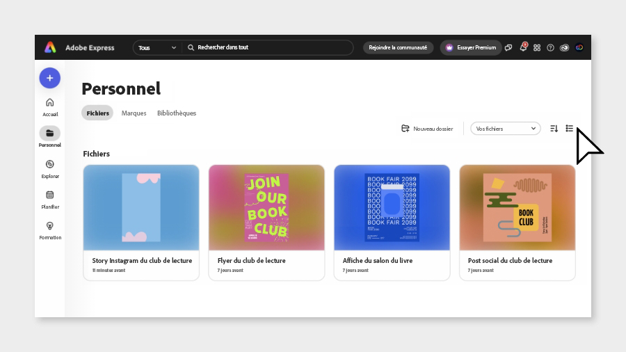 Sélectionnez Fichiers pour trouver vos vidéos en cours. Utilisez les icônes en haut à droite pour afficher vos fichiers dans une liste ou sous forme de vignettes.