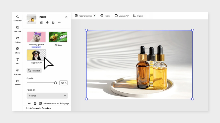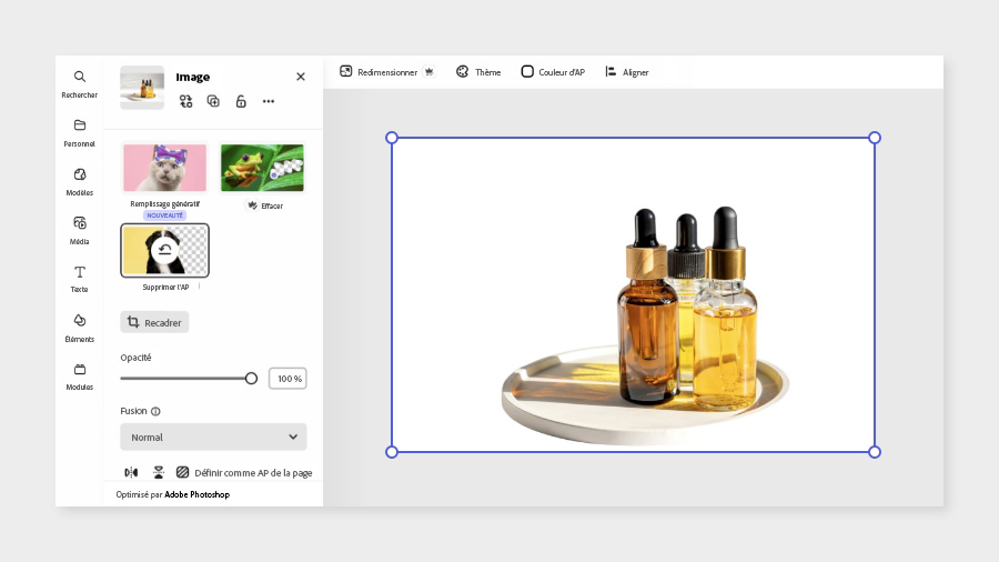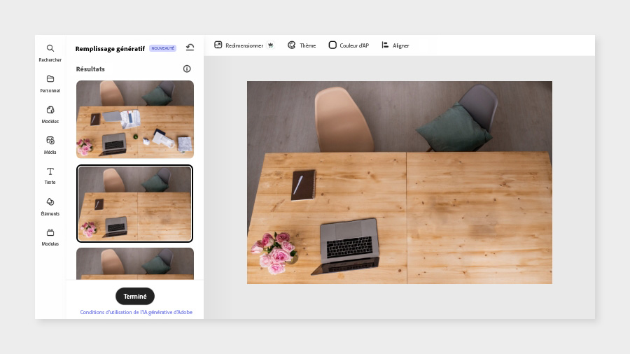 Sélectionnez une image de votre fichier pour afficher le panneau Image, puis choisissez Remplissage génératif.
