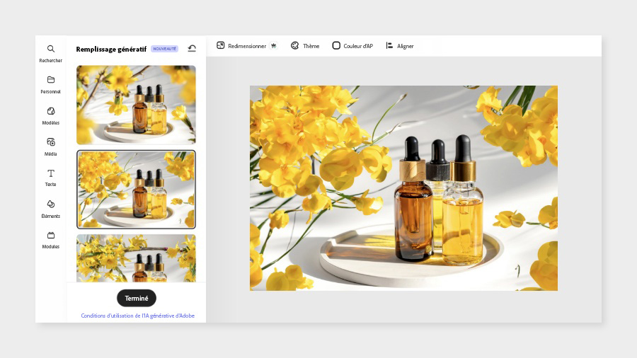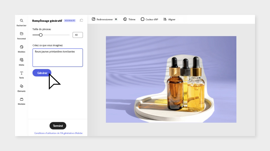 Donnez ensuite une nouvelle orientation à votre concept de campagne produit en ajoutant des éléments visuels à l’aide de l’outil de remplissage génératif. Sélectionnez les pourtours de l’objet dont l’arrière-plan a été supprimé avec le pinceau de remplissage génératif, saisissez un prompt comme « fleurs jaunes printanières tombantes », puis cliquez sur le bouton Générer.