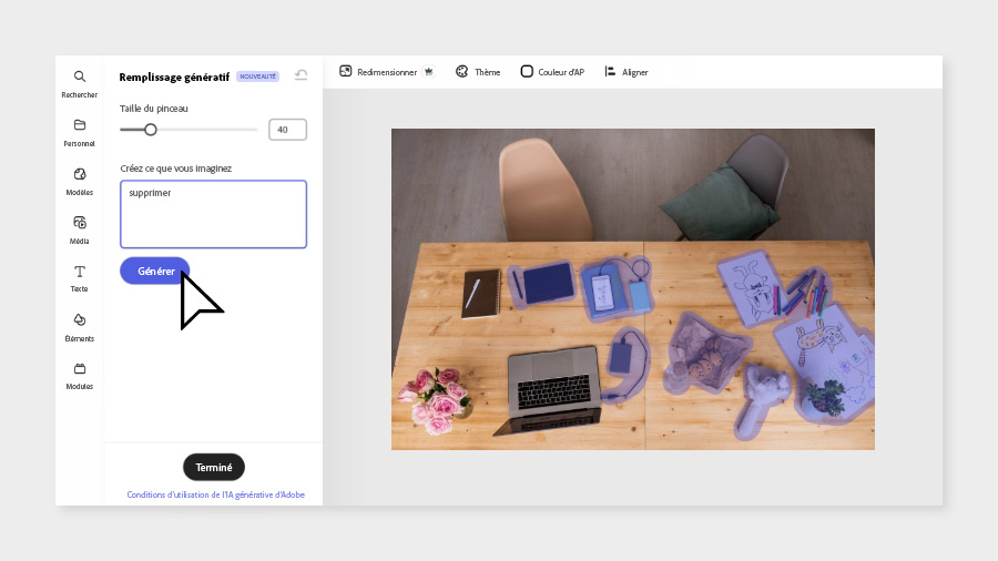 Pour renforcer la clarté visuelle sans gâcher l’ambiance à la fois lumineuse et chaleureuse, sélectionnez les objets indésirables avec le pinceau de remplissage génératif, puis saisissez « supprimer » dans le champ de prompt. Cliquez ensuite sur le bouton Générer pour obtenir une table épurée et une photo prête à être commercialisée par la même occasion.