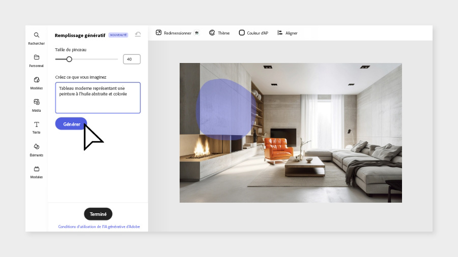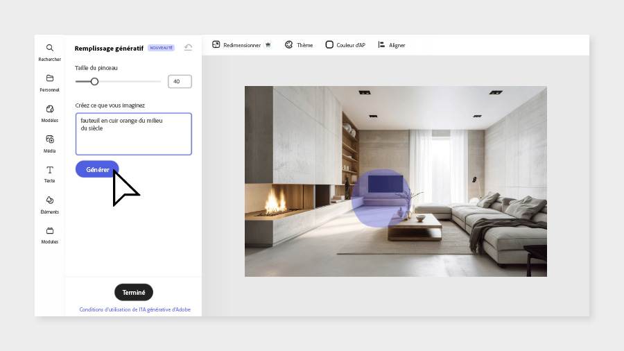 À l’aide de l’outil de remplissage génératif, ajoutez des éléments de design (en saisissant par exemple « fauteuil en cuir orange du milieu du siècle » ou « tableau moderne représentant une peinture abstraite et colorée »), sélectionnez la zone de l’image dans laquelle insérer ces éléments, décrivez les modifications souhaitées dans le champ de prompt, puis cliquez sur le bouton Générer. Ce brainstorming esthétique d’une redoutable efficacité ne manquera pas de séduire les architectes d’intérieur.