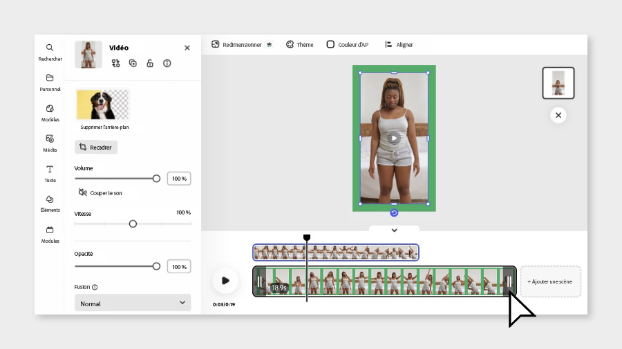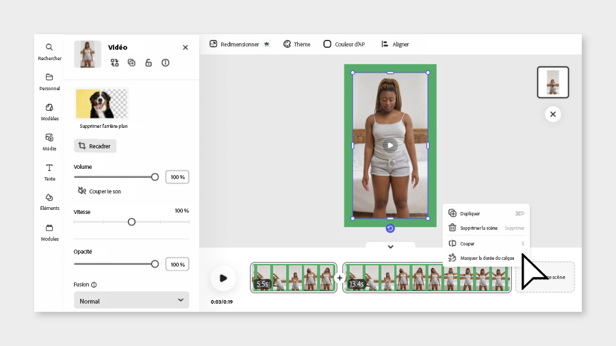 Couper quelques scènes dans une vidéo peut faire toute la différence. Supprimez facilement des parties de votre séquence et ajustez-la à la longueur souhaitée dans Adobe Express. Pour affiner le style et le rythme de votre vidéo, libre à vous également de modifier individuellement des scènes.