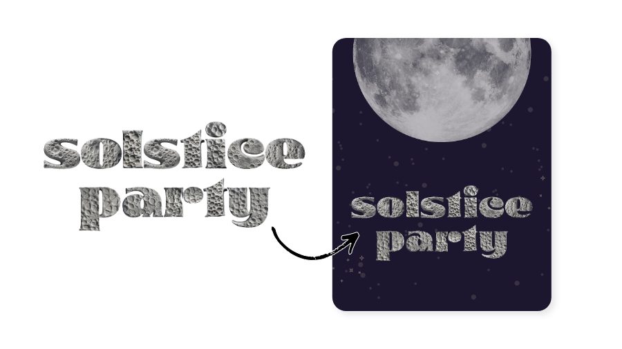 Vous pouvez créer facilement des invitations personnalisées reflétant parfaitement le thème de votre soirée avec les effets de texte IA de Firefly, qui leur confèrent par la même occasion une touche ludique et originale, comme c’est le cas de cette invitation esprit lunaire à une soirée célébrant le solstice. Lancez-vous avec le modèle ci-dessous, puis poursuivez les festivités dans Adobe Express après avoir rédigé un prompt succinct dans Firefly pour axer vos effets de texte sur la surface de la Lune.