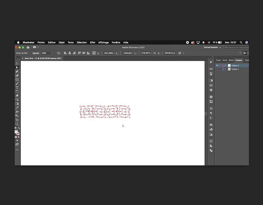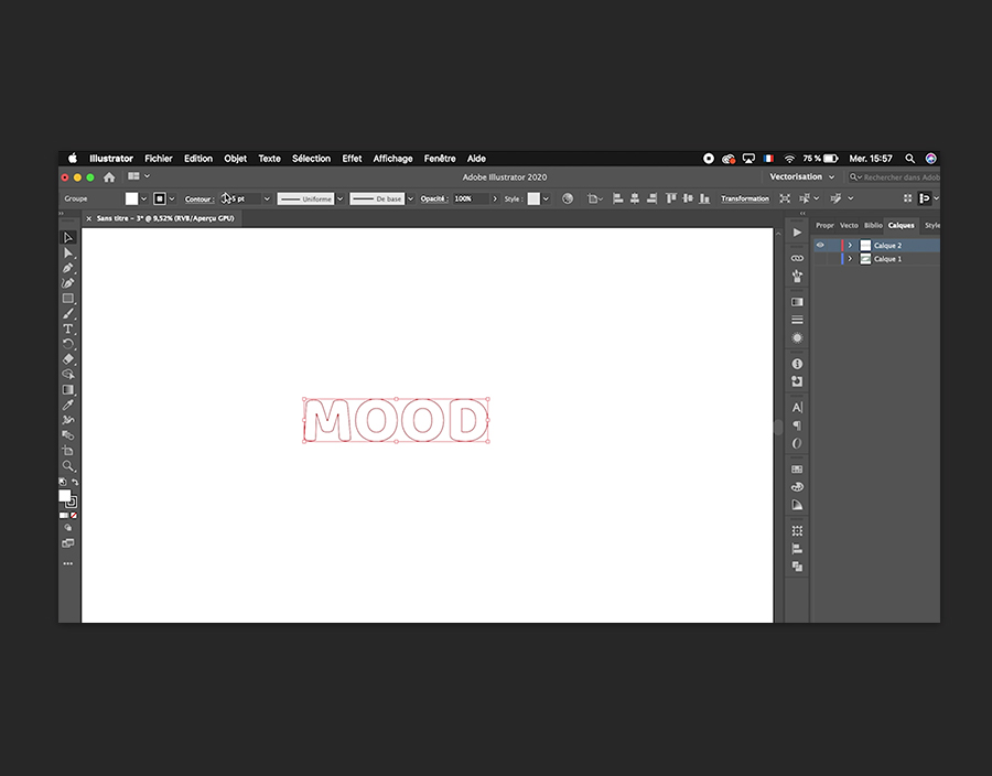 Choisissez Objet > Dégradé de formes > Décomposer. Accédez ensuite au panneau Pathfinder dans la barre d’outils à droite. Si vous ne le voyez pas, choisissez Fenêtre > Pathfinder. Cliquez sur Raccord. Dès que vous cliquez en dehors du texte, il disparaît. Cliquez à nouveau dessus et remplacez la couleur du Contour par le noir.