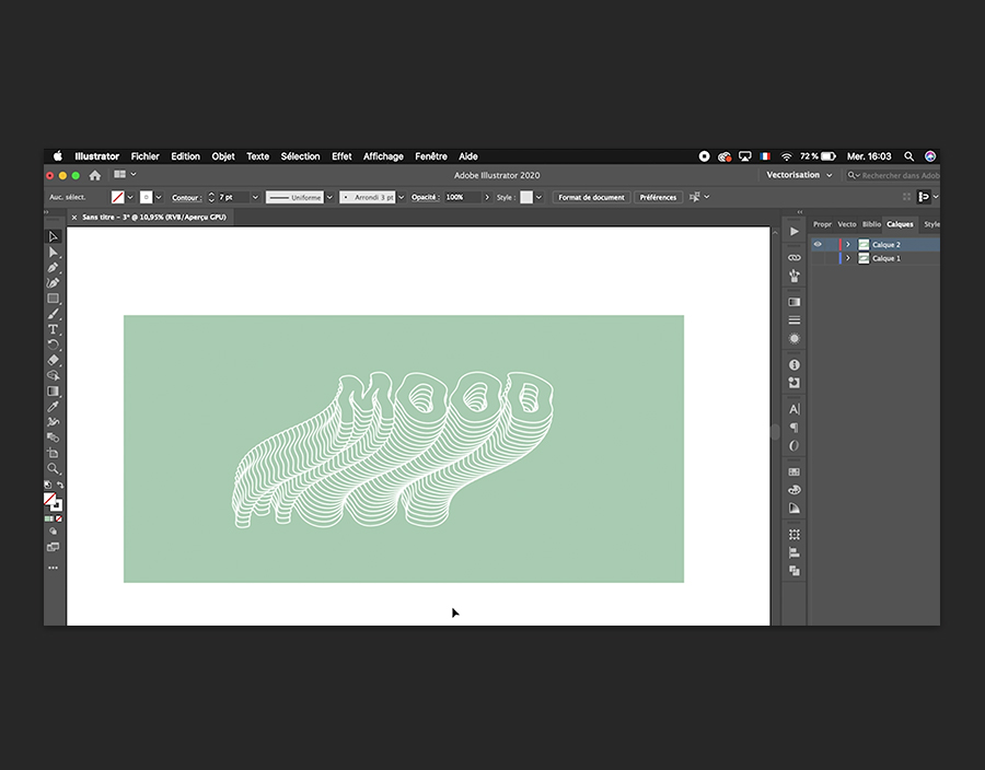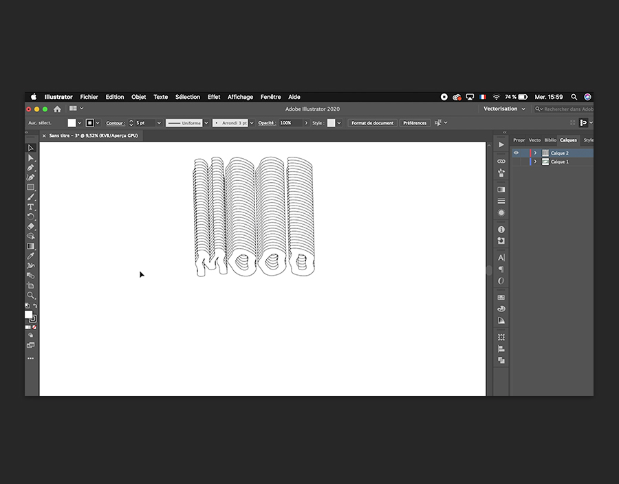 Le texte étant sélectionné, choisissez Objet > Décomposer et assurez-vous que les cases Objet et Arrière-plan sont cochées avant de cliquer sur OK. Vous devez maintenant le dupliquer. Pour ce faire, appuyez sur les touches Cmd/Ctrl et D, puis recommencez pour en avoir trois en tout. Activez l’outil Sélection, faites-les glisser tous les trois, puis choisissez Objet > Dégradé de formes > Créer . Vous obtenez un dégradé. Pour changer le nombre d’étapes du dégradé, double-cliquez sur l’outil Dégradé de formes dans la barre d’outils à gauche et augmentez ou diminuez la valeur.