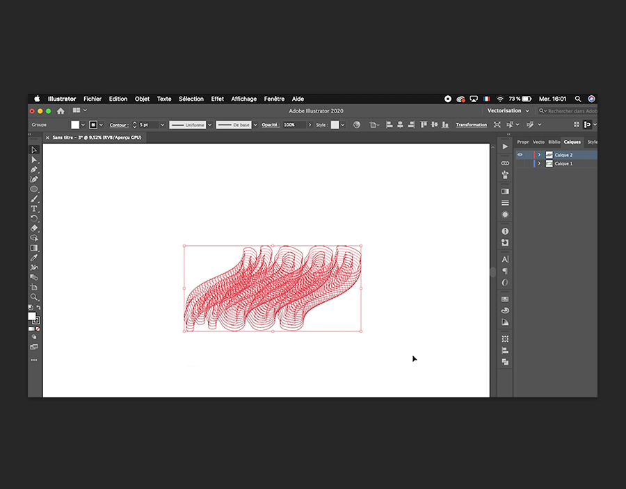 Vous devez d’abord créer la forme que le texte 3D doit suivre. Activez l’outil Ellipse dans la barre d’outils à gauche et tracez un cercle en dessous du texte. À l’aide de l’outil Sélection directe , supprimez une partie du cercle en conservant uniquement le quart inférieur gauche. Utilisez à nouveau l’outil Sélection directe pour créer une courbe verticale en cliquant sur un point d’ancrage et en le faisant glisser pour le faire tourner. Visionnez la vidéo de Manon pour obtenir une aide visuelle plus détaillée. Sélectionnez ensuite cette ligne et le dégradé. Choisissez Objet > Dégradé de formes > Remplacer le chemin. Le texte suit à présent la courbe de la ligne.