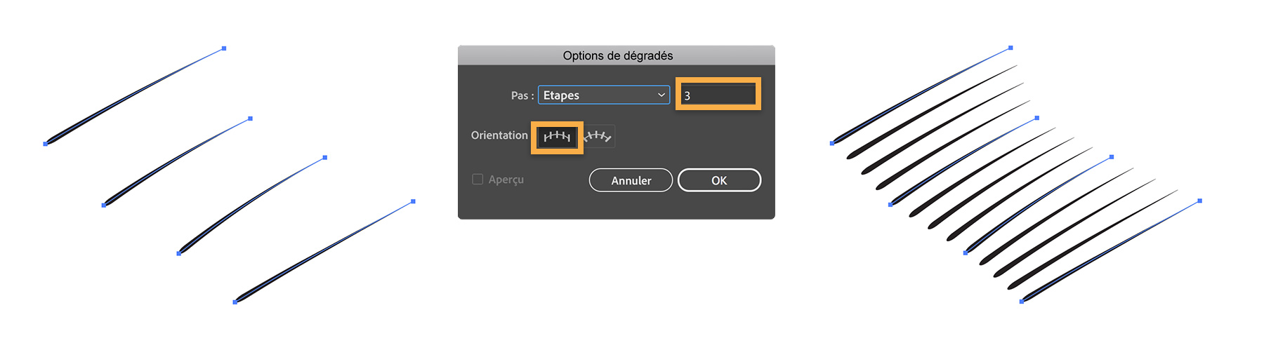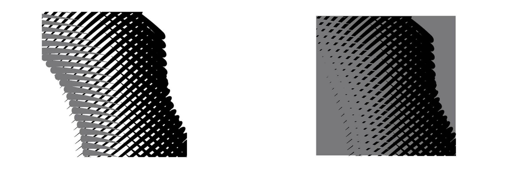 La composition de Tracie repose essentiellement sur l’utilisation de hachures. Grâce à cette technique, elle peut générer des effets d’ombre complexes. Pour créer les hachures, Tracie réalise quelques tracés à l’aide d’une forme personnalisée. Elle utilise l’outil Dégradé de formes (Objet > Dégradé de formes > Options de dégradé, puis Objet > Dégradé de formes > Créer) pour créer un ensemble de tracés parallèles. Elle crée ensuite un autre ensemble de tracés en suivant une orientation différente, puis elle superpose les deux pour obtenir un motif hachuré.