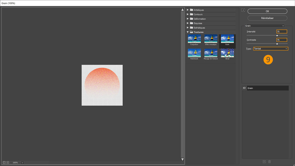 9. Augmentez l'intensité à 75 et le contraste à 75, puis choisissez Dilaté comme type de grain. Cliquez sur OK.