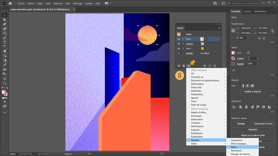 8. Appliquez ensuite une texture granuleuse. Pour ce faire, retournez dans le panneau Aspect, assurez-vous que le calque de fond dégradé est sélectionné et cliquez sur l'icône fx au bas du panneau. Choisissez Texture > Grain et ajustez le grain dans le nouvel espace de travail ouvert.