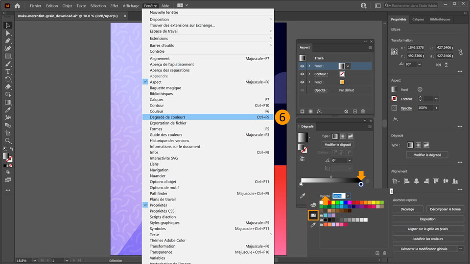 6. Choisissez Fenêtre > Dégradé de couleurs pour ouvrir le panneau Dégradé. Double-cliquez sur le curseur noir du dégradé à droite, sous l'aperçu du dégradé. Puis, cliquez sur l’icône Nuancier (la grille) sous l’icône Couleur (la palette) pour afficher les différentes nuances. Sélectionnez un rouge orangé.