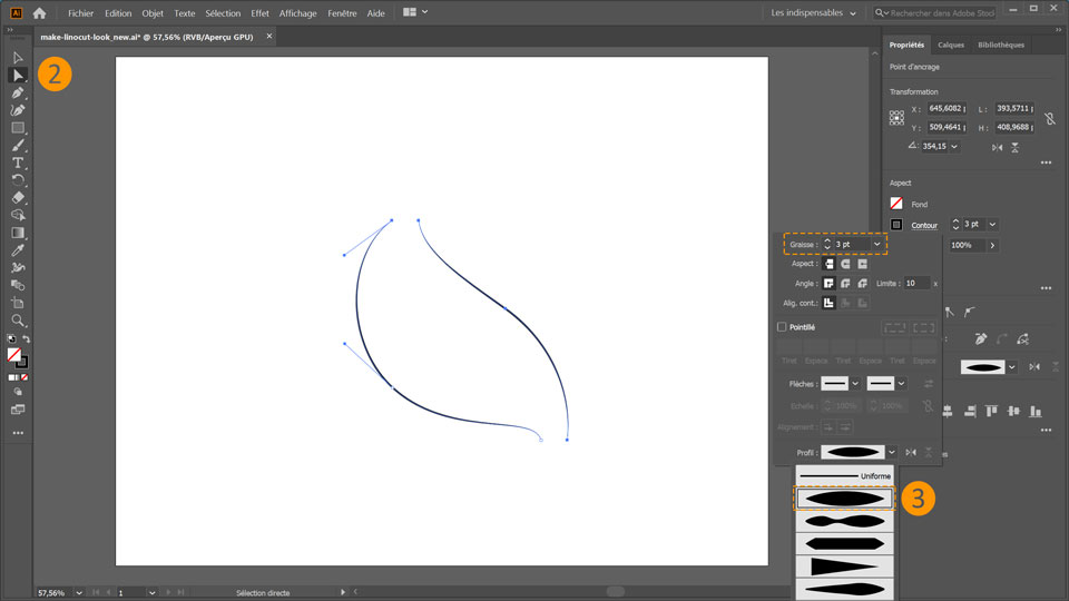 3. Dans la section Aspect du panneau Propriétés, cliquez sur Contour. Définissez le paramètre Graisse sur 3 pt et sélectionnez Profil de largeur 1 dans le menu déroulant Profil.