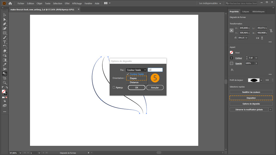 5. Dans la section Sélections rapides, cliquez sur Options de dégradés. Sélectionnez Étapes dans le menu déroulant Pas, puis spécifiez 12 étapes.