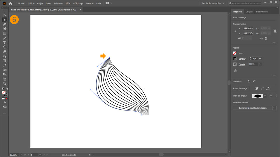 6. Utilisez l'outil Sélection directe pour fusionner le point supérieur de la ligne de gauche avec celui de la ligne de droite. Lorsque la partie supérieure est reliée, répétez l'opération avec les extrémités inférieures des lignes.