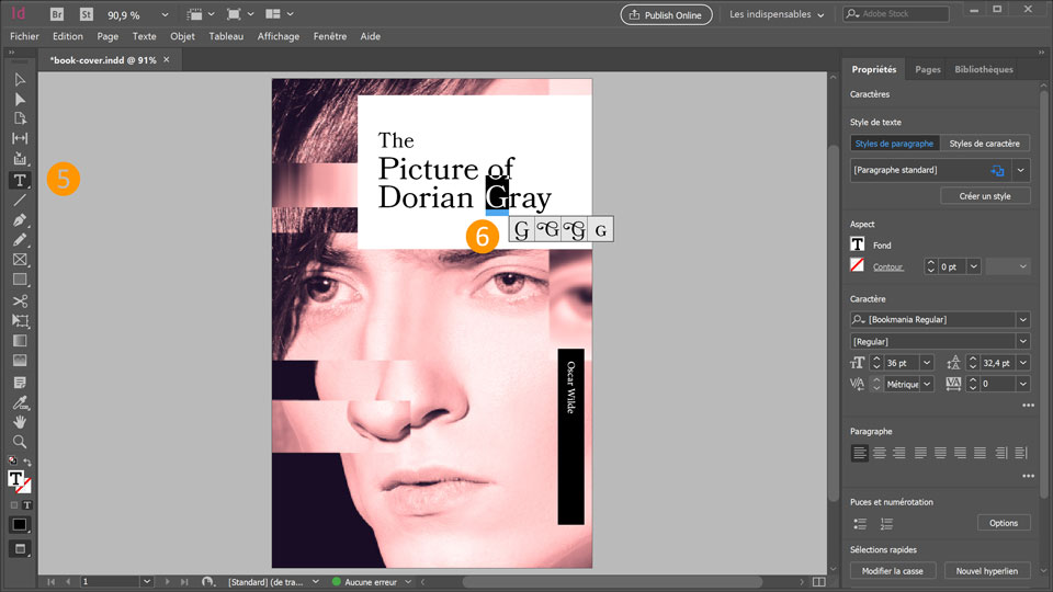 5. Revenez dans InDesign, choisissez l'outil Texte, puis sélectionnez la première lettre, G.