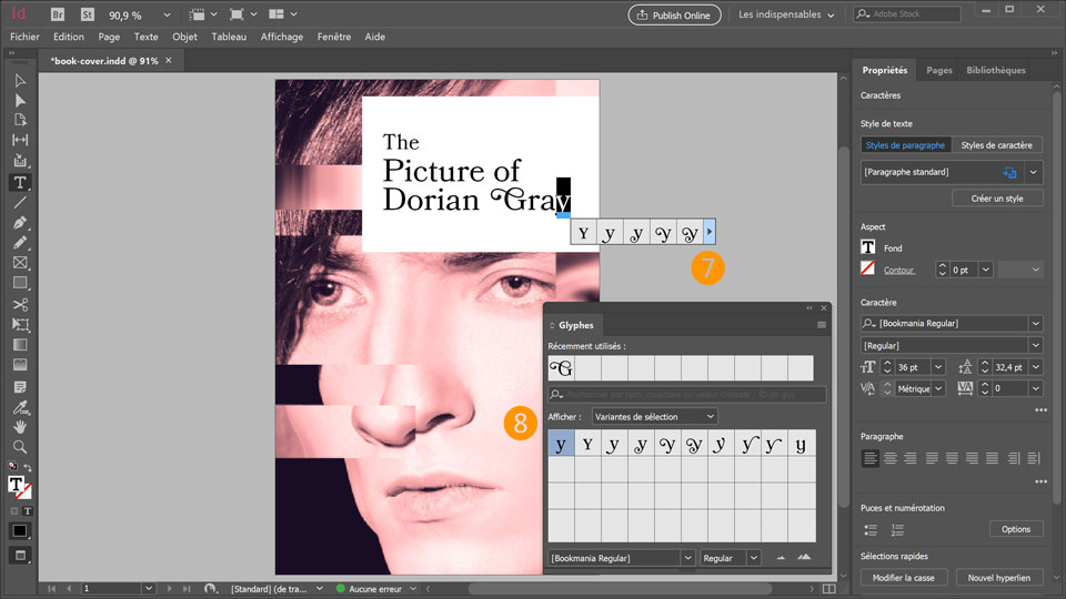 7. Pour accéder à la totalité des glyphes proposés pour une sélection, cliquez sur la flèche dans le menu contextuel pour ouvrir le panneau Glyphes. Double-cliquez sur un glyphe pour l’utiliser.