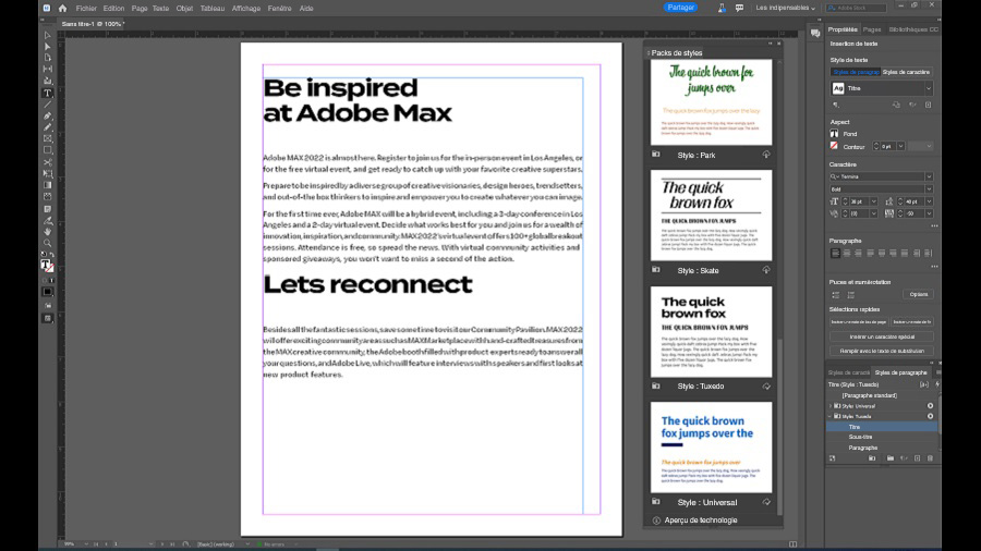 InDesign offre un aperçu de la technologie Style automatique, notre toute dernière fonctionnalité optimisée par Adobe Sensei, qui permet de convertir du texte non mis en forme en document de qualité en appliquant différents styles de paragraphe d’un simple clic. La fonctionnalité Style automatique analyse le document et met automatiquement en forme les titres, le corps du texte, les listes, etc.
