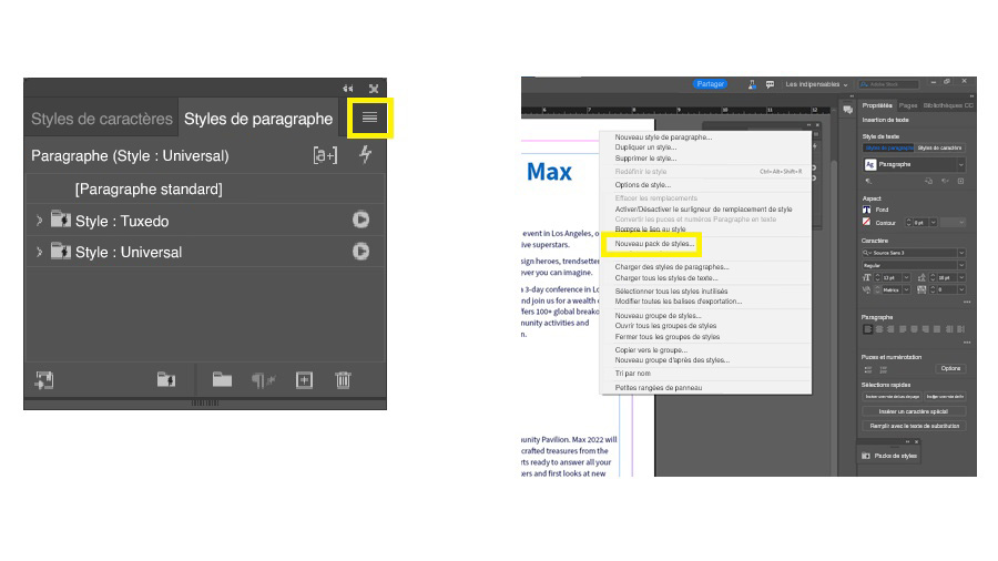 Cliquez pour afficher le menu de l’onglet Styles de paragraphe et choisissez Nouveau pack de styles.
