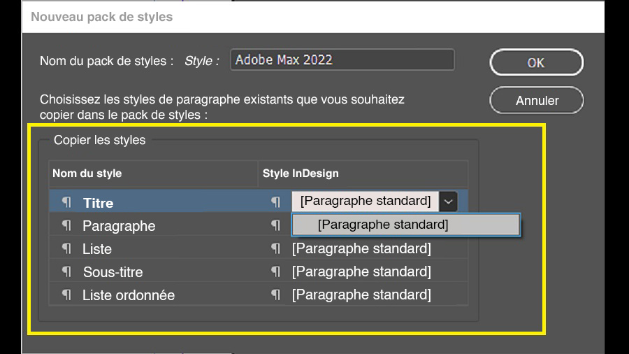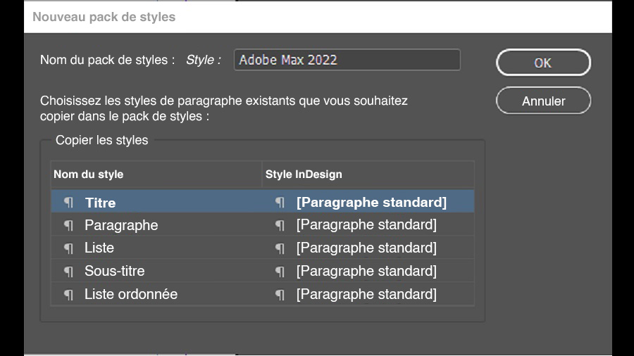 La boîte de dialogue Nouveau pack de styles s’affiche. Commencez par nommer votre pack de styles, puis, dans la liste déroulante, sélectionnez les styles de paragraphe à copier. InDesign les duplique alors dans le nouveau dossier Packs de styles. Une fois le pack de styles constitué, cliquez sur OK.