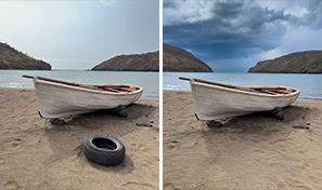 L'outil Détecter les objets étant activé, Lightroom identifie cet objet, élargit la zone ciblée et remplace le panneau par du contenu qui se fond parfaitement dans l'image.