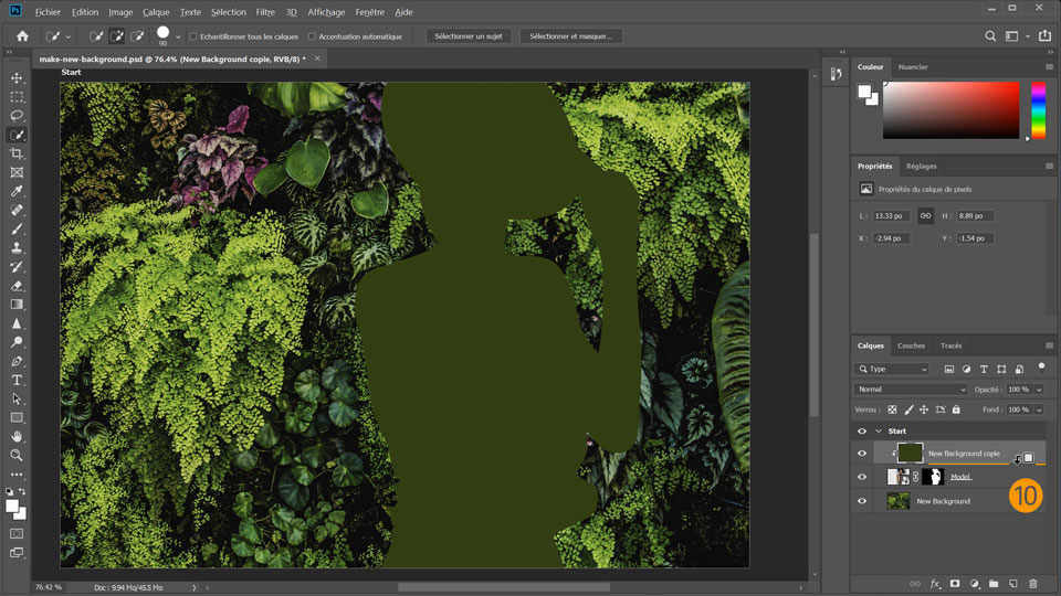10. Maintenez la touche Alt enfoncée et cliquez entre le calque vert et le calque Model pour créer un masque d’écrêtage. Le vert est à présent appliqué au modèle.