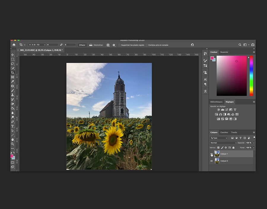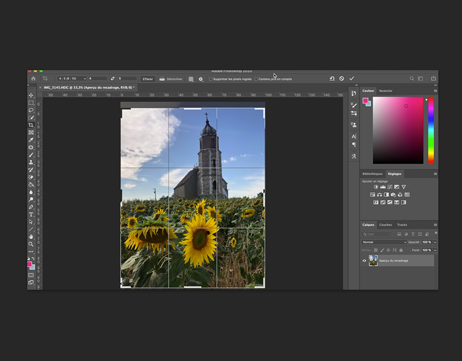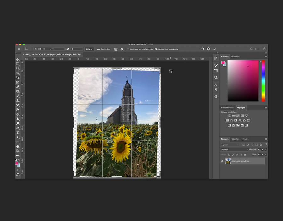 Dans la barre d’outils à gauche, sélectionnez l’outil Recadrage. Dans la barre d’options au-dessus, choisissez le format Instagram, 4:5. Assurez-vous que la case Contenu pris en compte est cochée. Une zone de recadrage apparaît alors autour de la photo. Vous pouvez cliquer dessus et, sans relâcher le bouton, la faire glisser pour recadrer la photo à votre convenance. Appuyez sur la touche Entrée dès que vous êtes satisfait et attendez que la magie de Photoshop opère. C’est aussi simple que cela. Votre photo est à présent optimisée pour Instagram.