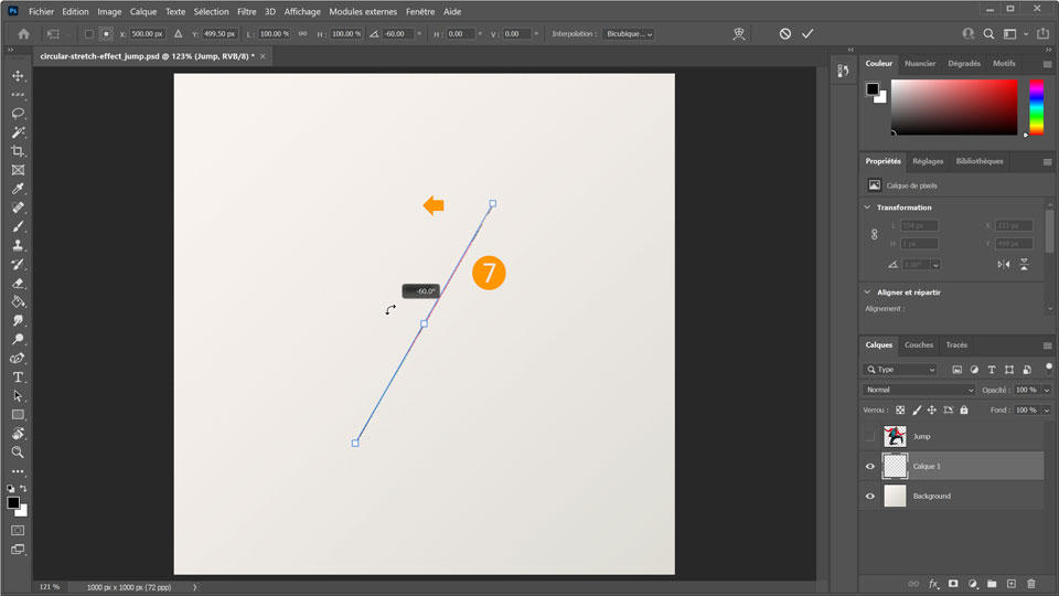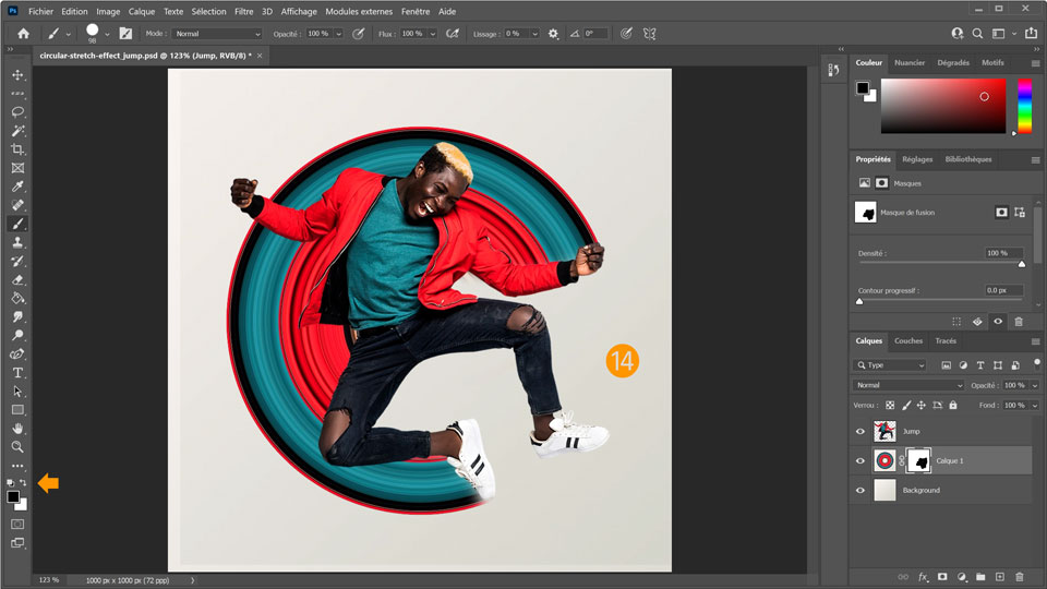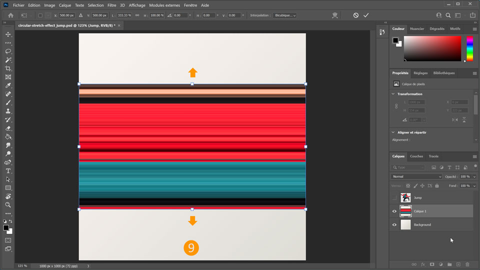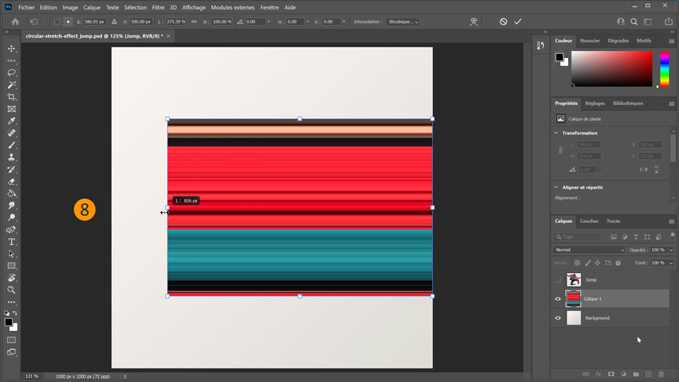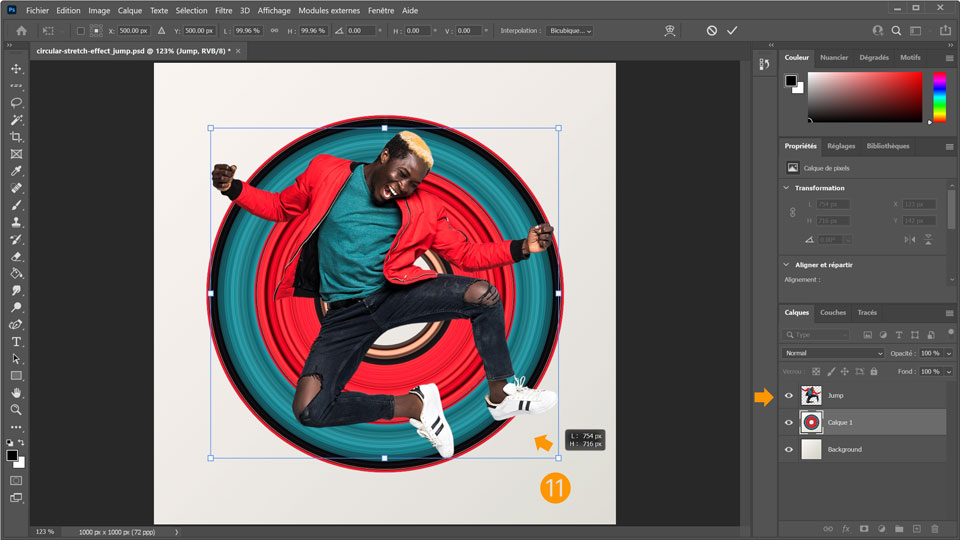 11. Réaffichez le calque « Jump » et modifiez la taille de l’étirement circulaire à l’arrière en maintenant la touche Alt enfoncée et en faisant glisser la poignée.