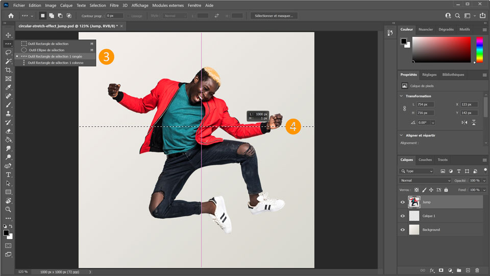 3. Sélectionnez le calque « Jump », puis cliquez sur l'outil Rectangle de sélection et, tout en maintenant la souris enfoncée, sélectionnez l'outil Rectangle de sélection 1 rangée dans le menu contextuel.