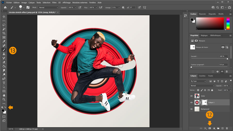 14. Continuez à peindre le masque en noir jusqu’à ce que toutes les parties inutiles de l’effet circulaire soient masquées. Pour révéler à nouveau certaines parties, choisissez le blanc comme couleur de premier plan et peignez.