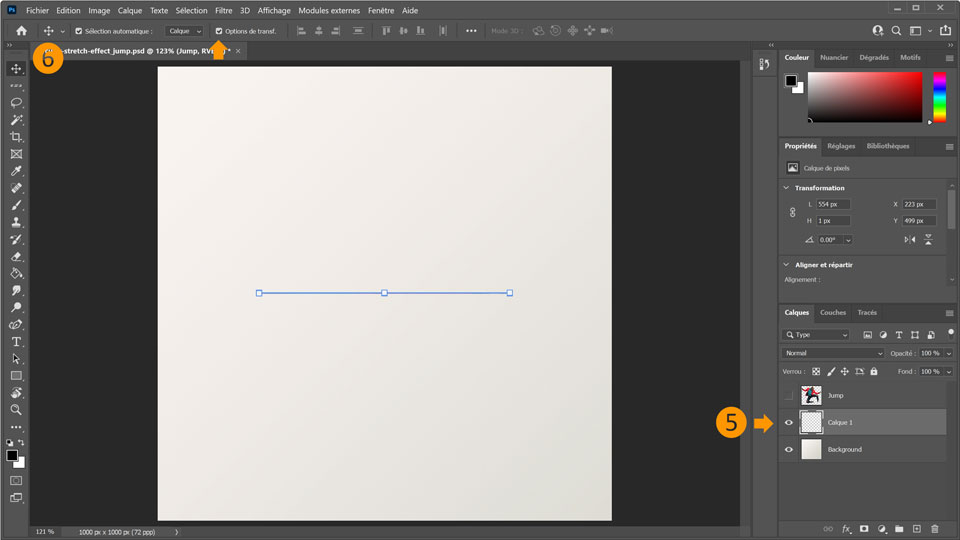 6. Pour faire pivoter et étirer la ligne de couleurs, sélectionnez l'outil Déplacement et cochez la case Options de transf. Trois poignées apparaissent.