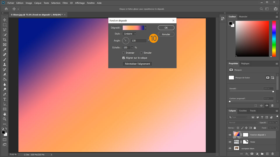 Conseil : lorsqu'un masque de fusion est sélectionné pour être retouché, les seules couleurs disponibles sont le noir et le blanc. Peignez avec du noir sur le masque de fusion pour révéler davantage de détails du calque « bison », ou avec du blanc pour masquer certains éléments.