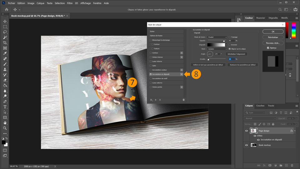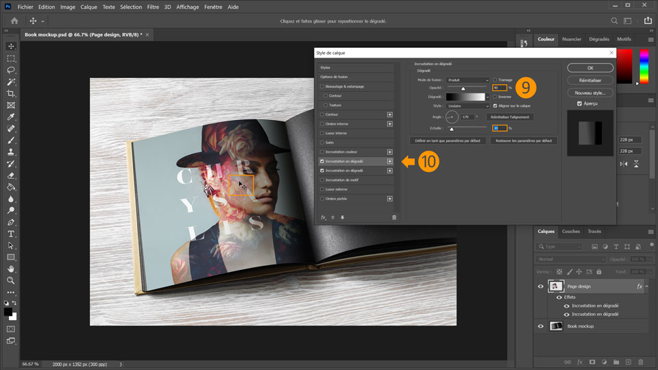 7. Avec la boîte de dialogue Style de calque ouverte, utilisez l’outil Sélection pour faire glisser le dégradé et le repositionner le long de la reliure de la page. Le résultat est plus réaliste avec une ombre au niveau du pli.