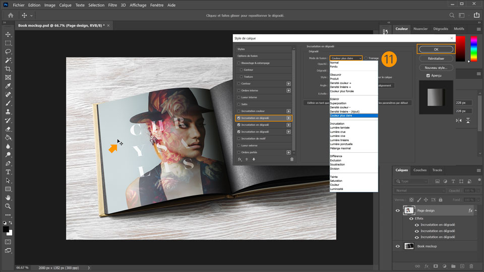 11. Optez pour le mode de fusion Superposition. Faites glisser le dégradé sur l'illustration pour repositionner l’effet d’éclairage sur la gauche de la page. Cliquez sur OK lorsque vous avez terminé.