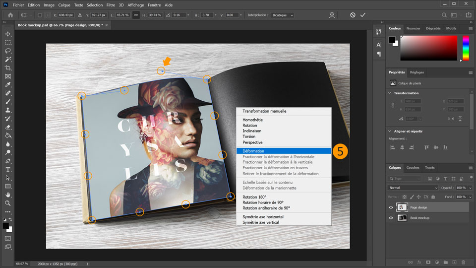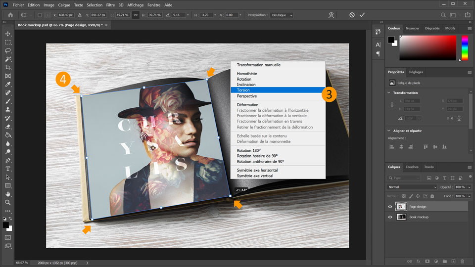 2. Sélectionnez le calque « Page design » et appuyez sur Ctrl + T (Windows) ou Cmd + T (macOS) pour ouvrir l’outil Transformation. Faites glisser votre création sur la page de gauche du livre ouvert, puis faites-la pivoter d’environ 12 degrés pour qu’elle coïncide plus ou moins avec l’angle de la page.