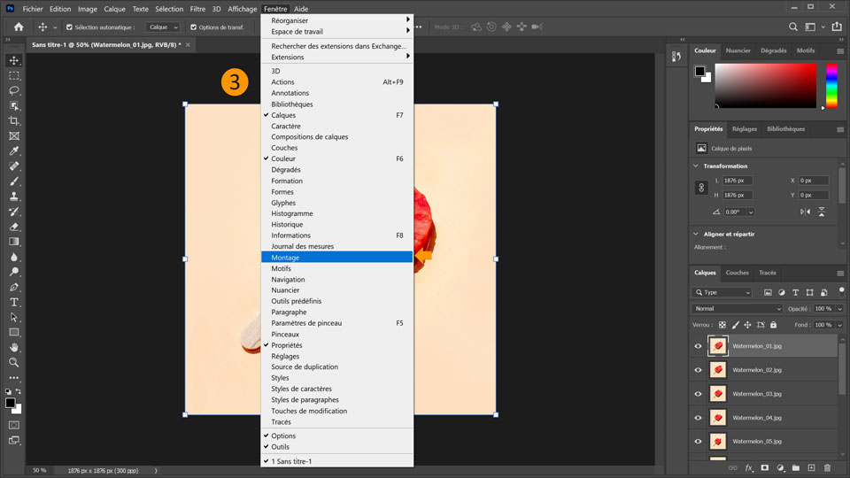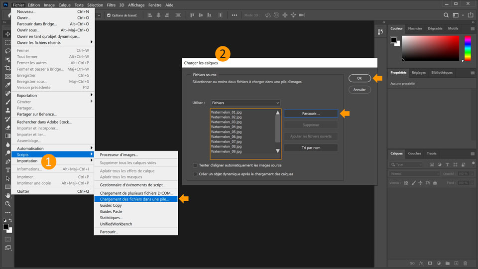 1. Téléchargezles fichiers d’exemple . Il y a 11 fichiers pour la pastèque. Ne les ouvrez pas un par un, chargez-les tous sous forme de calques dans un seul fichier : Dans Photoshop, choisissez Fichier > Scripts > Chargement des fichiers dans une pile.