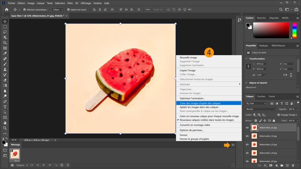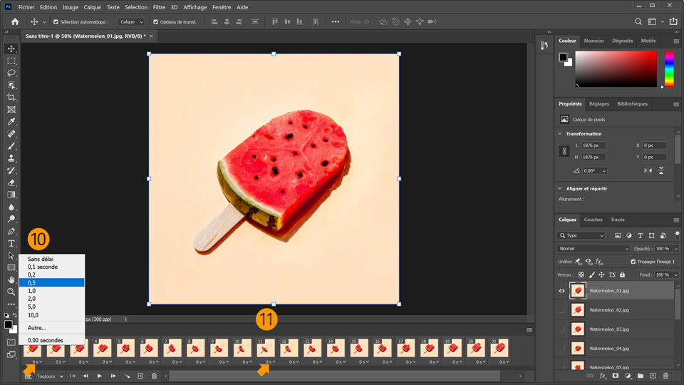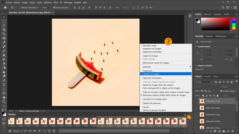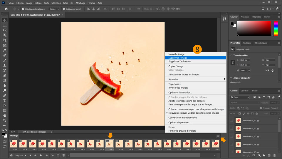8. Des images 1 à 11, la pastèque se désagrège, et des images 12 à 22 elle se reconstitue. Les images 11 et 12 étant les mêmes, supprimez l’image en double au milieu de l’animation. Cliquez sur l’image 12 et choisissez Supprimer l’image dans le menu.