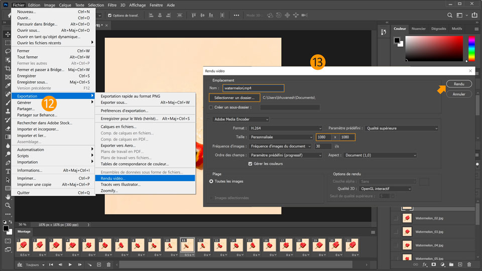 12. Enregistrez l’animation sous forme de vidéo pour Instagram. Choisissez Fichier > Exportation > Rendu vidéo.