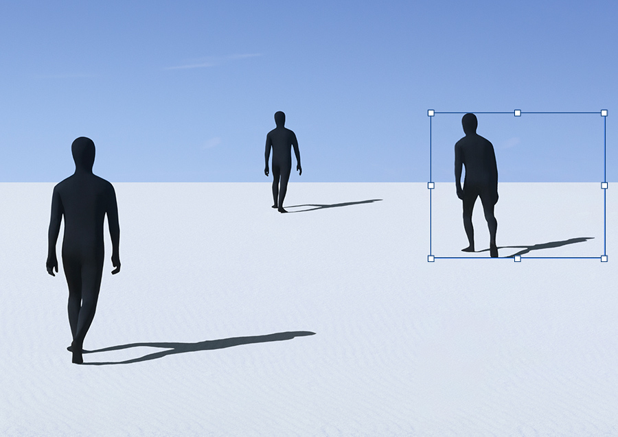 Gabriel Isak a ensuite ajouté un personnage dans la composition. Pour ce faire, il a ouvert le document Photoshop contenant le personnage solitaire et choisi Sélection > Plage de couleurs. Il a cliqué sur l’icône de pipette Ajouter, puis sur le personnage et son ombre pour sélectionner les deux. Avec l’outil Déplacement, il a ajouté la sélection sur l’image originale en faisant glisser la sélection sur l’onglet de l’autre fichier, en maintenant le bouton de la souris enfoncé jusqu’à ce que ce fichier s’affiche au premier plan, puis en positionnant la sélection.