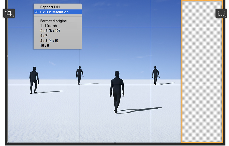 Pour équilibrer la composition, Gabriel Isak a choisi l’outil Recadrage, l’a défini sur Libre dans la barre d’options, puis a fait glisser la poignée pour étendre la zone de travail sur la droite. Avec l’outil Rectangle de sélection, il a ensuite sélectionné la nouvelle zone de travail vierge.