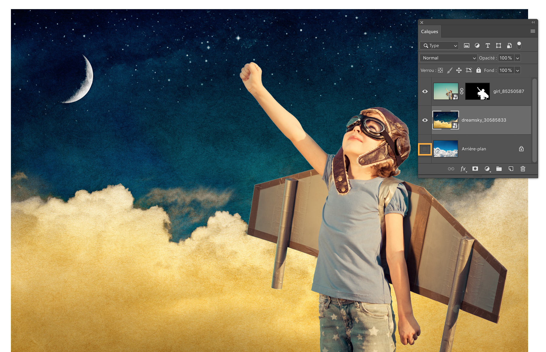 Libre à vous d’utiliser vos propres fichiers ou ceux fournis en exemple pour tester ces techniques. Ouvrez d’abord l’image avec des nuages blancs. Photoshop nomme ce calque « Arrière-plan ». Sélectionnez l’image de la fillette sur votre ordinateur et faites-la glisser vers le document ouvert. Utilisez les poignées d’angle pour redimensionner l’image, puis appuyez sur Entrée ou Retour pour la mettre en place. Assurez-vous que le panneau Calques (Fenêtre > Calques) est bien affiché.