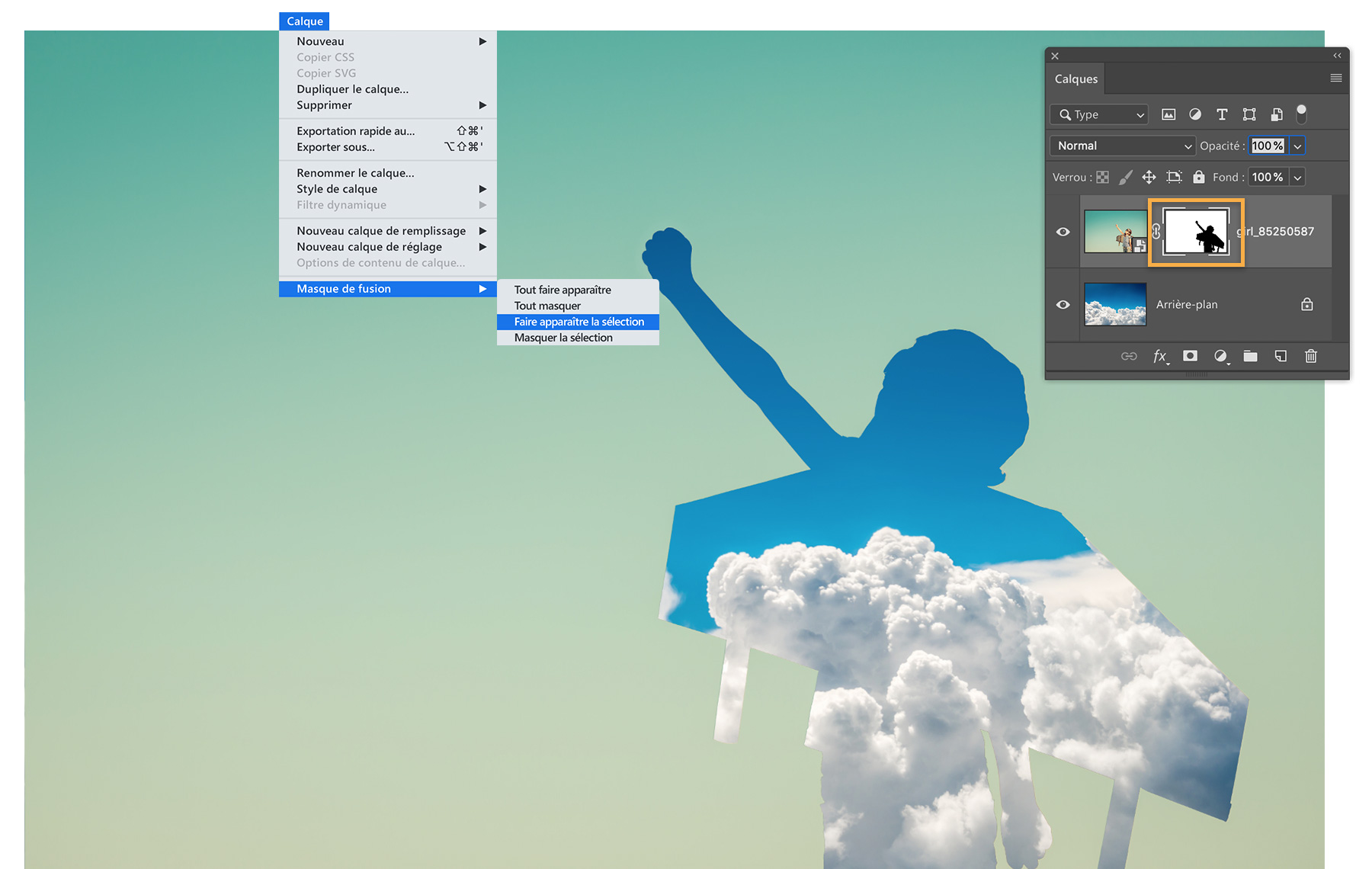 Utilisez un masque de fusion pour associer la sélection au calque d’arrière-plan et obtenir ainsi une nouvelle composition. Vérifiez que le calque de la fillette est toujours sélectionné, puis choisissez Calque > Masque de fusion > Faire apparaître la sélection. La zone sélectionnée reste visible, et la fillette (la zone non sélectionnée) est masquée pour révéler le contenu du calque inférieur. Dans le panneau Calques, une nouvelle icône en regard du calque de la fillette indique qu’un masque est désormais associé au calque. La partie blanche du masque correspond aux zones visibles et la partie noire au contenu qui a été masqué pour laisser transparaître l’image du calque inférieur.