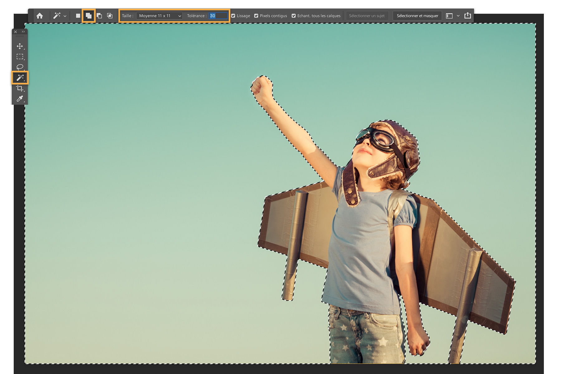 Utilisez l’outil Baguette magique pour sélectionner la couleur d’arrière-plan autour de la jeune fille. La Baguette magique offre un résultat optimal lorsque le contraste entre le sujet et l’arrière-plan est très net. Modifiez les paramètres de l’outil Baguette magique à votre convenance. La capture d’écran ci-dessous présente les paramètres que nous avons utilisés pour cette image. Vous devrez peut-être les modifier si vous retouchez une photo différente. Cliquez sur la zone autour de la fillette jusqu’à ce qu’elle soit entièrement sélectionnée. Les contours de la sélection sont marqués par une série de pointillés en mouvement.