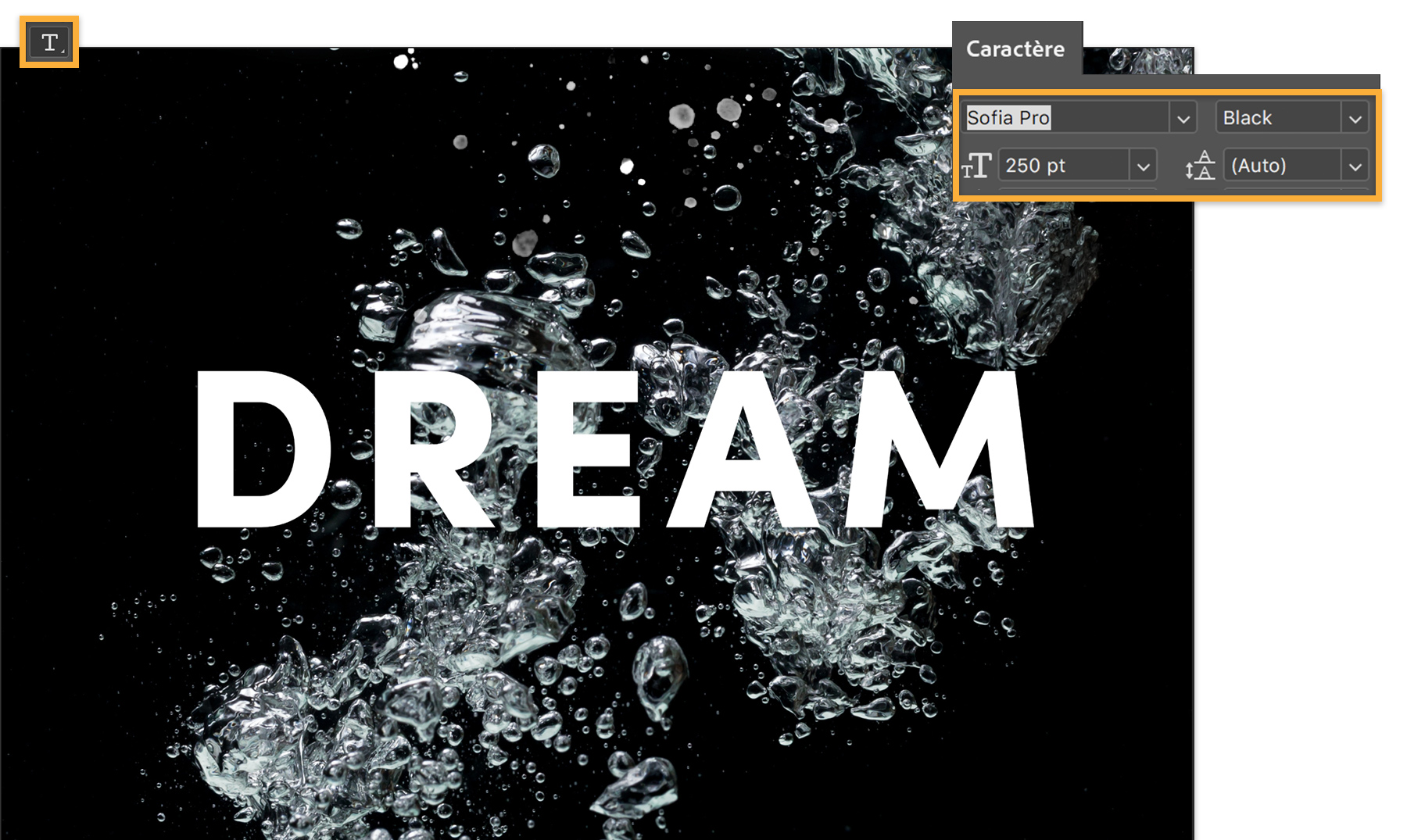 Sur l’image d’eau d’origine, Lidia Lukianova a saisi le mot DREAM et converti le calque de texte en objet dynamique.