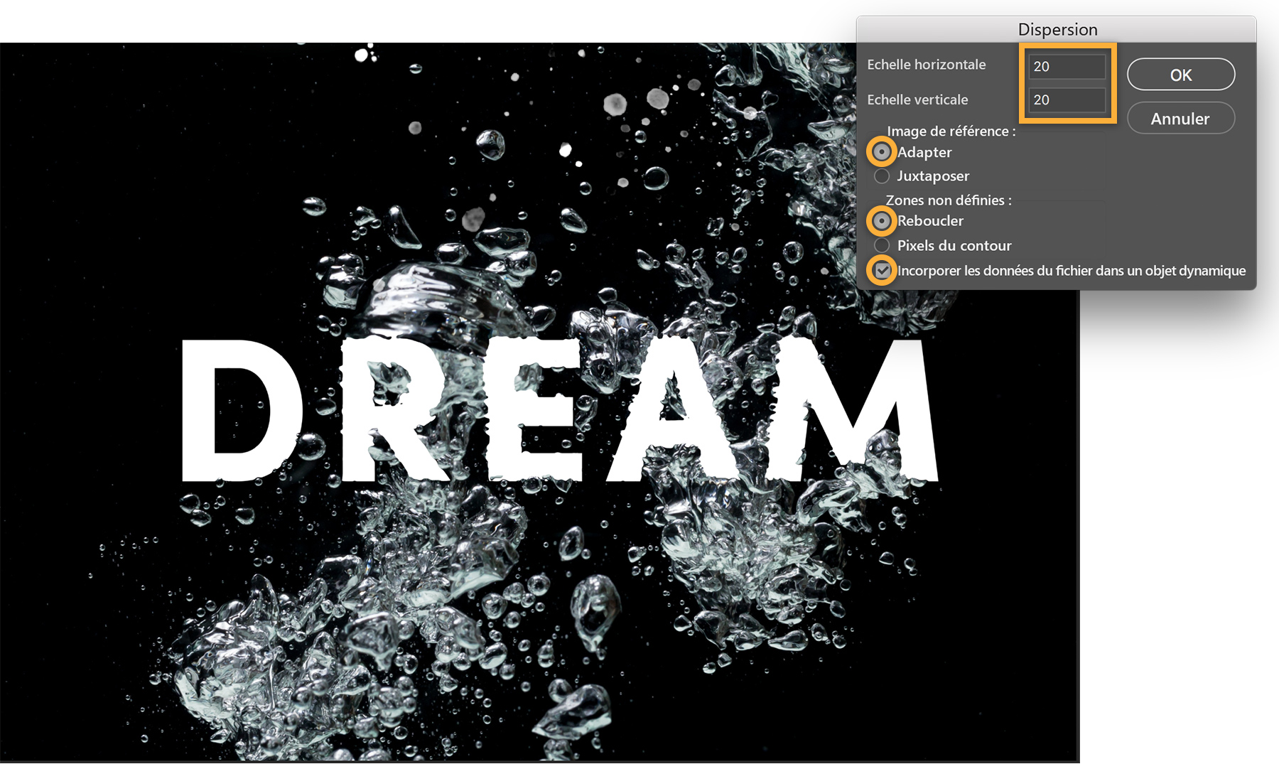 Pour modeler le texte autour des bulles, appliquez le filtre Dispersion (Filtre > Déformation > Dispersion) et réglez les paramètres pour obtenir l’effet souhaité. Ensuite, lorsque vous y êtes invité, sélectionnez le document Photoshop enregistré précédemment pour l’utiliser comme image de référence.